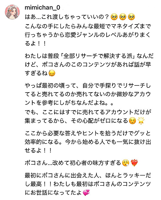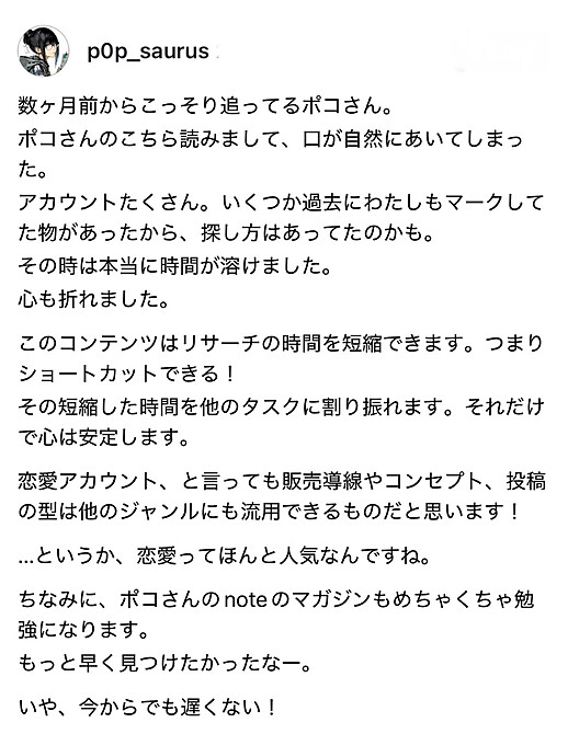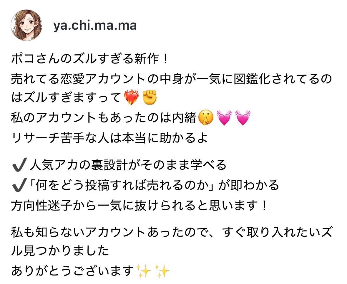 特典でつけた時にも、「売れてる恋愛アカウント集」だけを個別で売ってほしいという要望がとても多かったんですよね❗