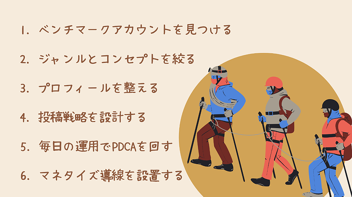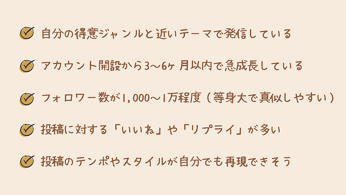 1. リサーチ 成功しているアカウントを観察し、ベンチマークを見つけて真似る